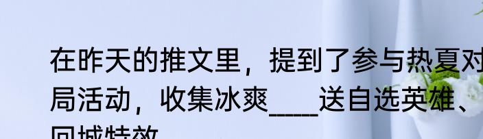 一、在昨天的推文里,提到了参与热夏对局活动,收集冰爽______送自选英雄、回城特效。(二个字)