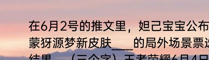 在6月2号的推文里,妲己宝宝公布了蒙犽源梦新皮肤______的局外场景票选结果。(三个字)王者荣耀6月4日答案