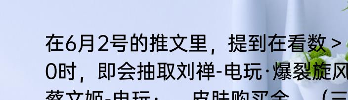 一、在6月2号的推文里,提到在看数>500时,即会抽取刘禅-电玩·爆裂旋风、蔡文姬-电玩·_____皮肤购买金。(三个字)。