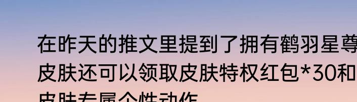 在昨天的推文里提到了拥有鹤羽星尊皮肤还可以领取皮肤特权红包*30和皮肤专属个性动作