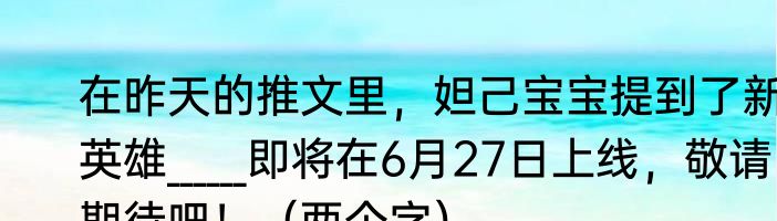 在昨天的推文里,妲己宝宝提到了新英雄______即将在6月27日上线,敬请期待吧!(两个字)